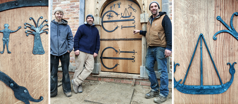 Nach langen Überlegungen und Recherche haben wir uns für die große Eingangstür der Apotheke (das neu entstandene große Fachwerkhaus) nochmal für eine aufwendig gestaltete Version entschieden. Unser Grobi, der die meiste Recherchearbeit in unserem Projekt leistet, verliebte sich in die wohl älteste Tür Englands. Die Tür aus der St. Helen‘s Church in Stillingfleet, Yorkshire. Zu sehen sind Adam und Eva, ein Drachenschiff und Schnabelkopfdekorationen. Sie ist normannisch geprägt und wird auf 1145 geschätzt. Diese Tür haben unser Freund Fabi, Kunstschmied, und sein Geselle Fritz für uns rekonstruiert.