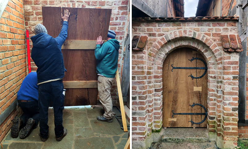 Anfang Januar, vor dem strengen Frost, haben unser Schmied Fabian Droste und unser Zimmermannsmeister Malte Stemmler aber endlich die großen Tore vom Kloster einbauen können.