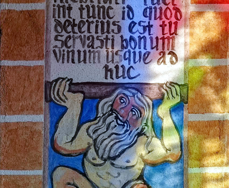 Unser Klosterkünstler Felix Karweick hat inzwischen im Refektorium das letzte, große Wandbild entworfen und angefangen, auf die Wand im Kloster zu übertragen. Außerdem hat er die Entwürfe für die beiden Prachtfenster, die noch im Refektorium fehlen, an die Landesberufsschule der Glaser übergeben, die sich erneut mit den Auszubildenden um die Umsetzung in Bleiverglasung kümmern. Eine langjährige Kooperation seit 2018.